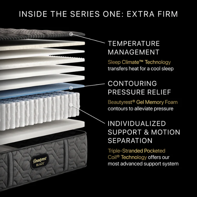 Experience the best of Beautyrest®, featuring advanced temperature management technology, premium foams, and advanced, Triple-Stranded Pocketed Coil® Technology for conforming support and motion separation. With the inclusion of premier materials and advanced sleep technology, the Beautyrest Black® Collection optimally aligns at the intersection of luxury and innovation for an extraordinarily comfortable sleep.